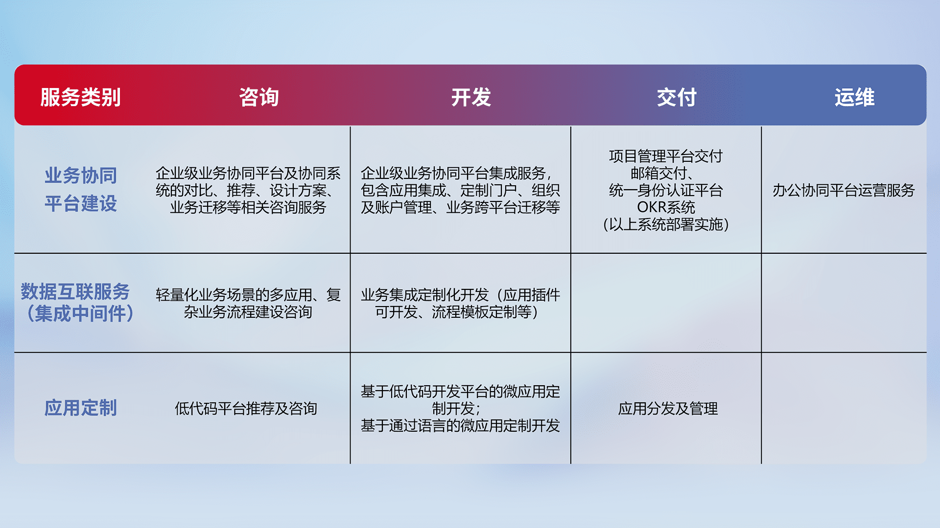 针对钉钉、、、企微、、、、IDaas等平台级产品提供产品的规划、、方案、、、、交付、、定制化开发等服务,,实现如统一协同办公、、智能客户服务、、、混合会议管理、、、、智能数据查询、、、、等业务场景,,实现数字化转型。。。。