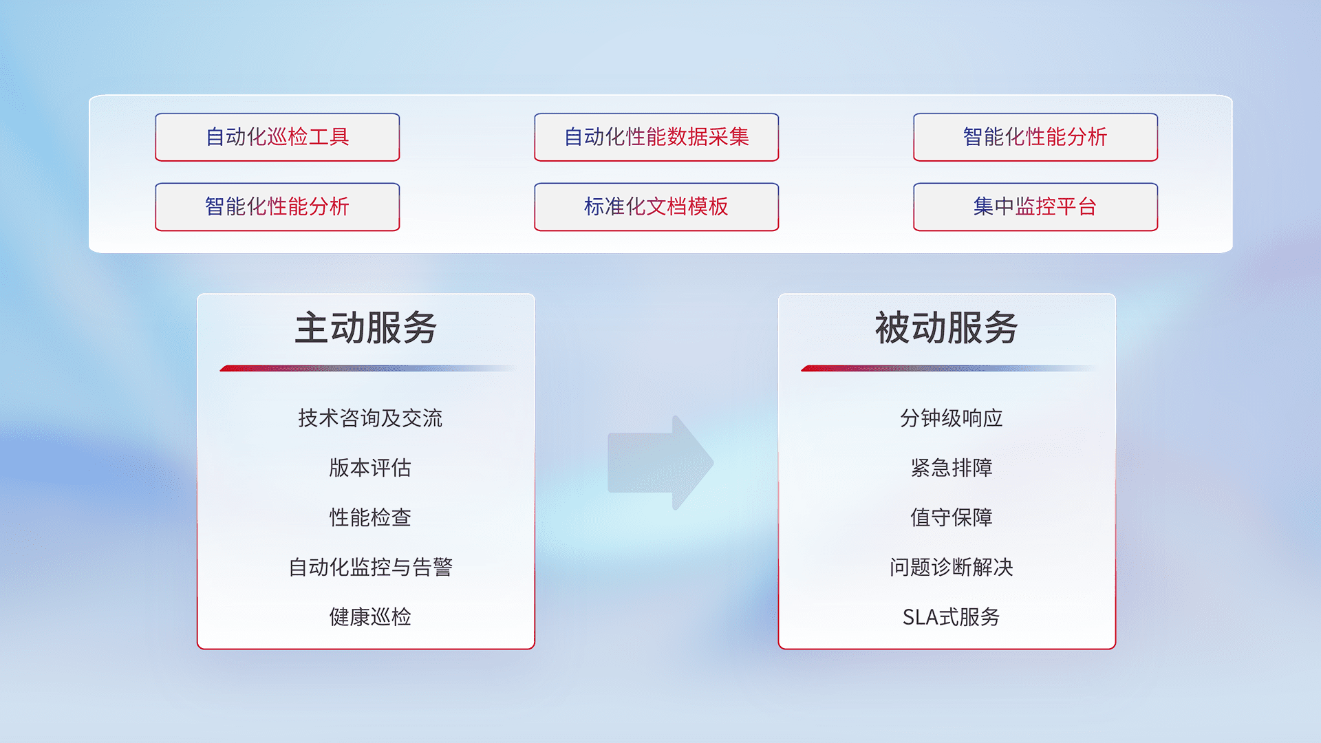 智能化工具和标准化文档,,,,保障服务质量,,,提供主动服务(包含技术咨询、、、、版本评估、、、、性能检查、、、、自动化监控与告警、、、健康巡检)和被动服务包含(分钟级响应、、紧急排障、、值守保障、、问题诊断解决、、、SLA服务)。。。。